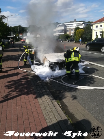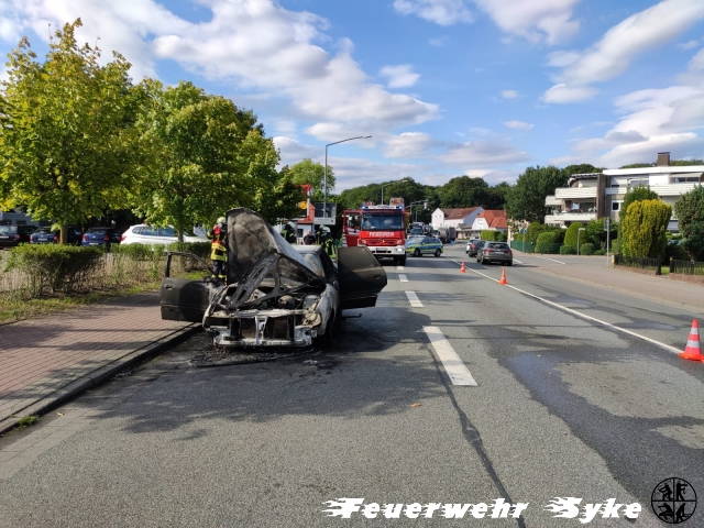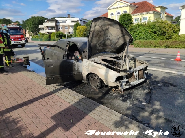 Syke (ts) Die Ortsfeuerwehr Syke wurde am 23.07.2020 gegen 17:00 Uhr mit dem Einsatzstichwort „Beginnender PKW-Brand“ in die Straße „Herrlichkeit“ gerufen. Auf der Rechtsabbiegerspur zum „Hachepark“ war ein Audi während der Fahrt in Brand geraten. Beim Eintreffen der Ortsfeuerwehr Syke stand das Fahrzeug bereits in Vollbrand. Zwei Trupps unter Atemschutz löschten das Fahrzeug mittels Wasser und Schaum ab. Die betroffene Fahrerin wurde vom Rettungsdienst betreut. Für die Löscharbeiten wurde die Bundesstraße in Fahrtrichtung Heiligenfelde gesperrt. In der Folge staute sich der aus Bremen kommende Berufsverkehr stark auf, da vor allem LKW keine Wendemöglichkeit hatten. Nachdem das kontaminierte Löschwasser vom Klärwerk abgepumpt wurde, konnte die Feuerwehr ihren Einsatz nach ca. einer Stunde beenden und die Einsatzstelle an die Polizei übergeben. Diese sperrte die Rechtsabbiegerspur weiterhin ab, da das „bestellte“ Abschleppunternehmen zu diesem Zeitpunkt noch nicht vor Ort war. Neben den ca. 18 Einsatzkräften der Ortsfeuerwehr Syke, waren der Rettungsdienst, die Polizei, das Klärwerk, sowie ein Abschleppunternehmen an dem Einsatz beteiligt. Lobend ist hervorzuheben, dass weder das hohe Verkehrsaufkommens in Richtung Bremen, noch die vielen einkaufenden Menschen auf dem Hacheparkgelände den Einsatzerfolg behinderten, und sich alle fast alle vorbildlich verhalten haben.