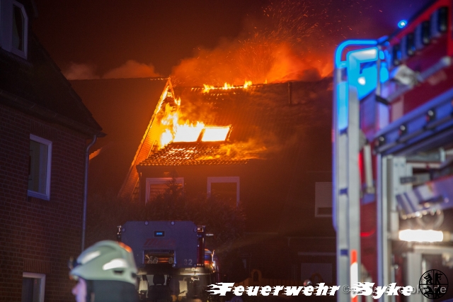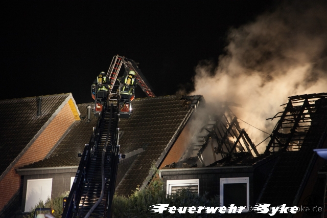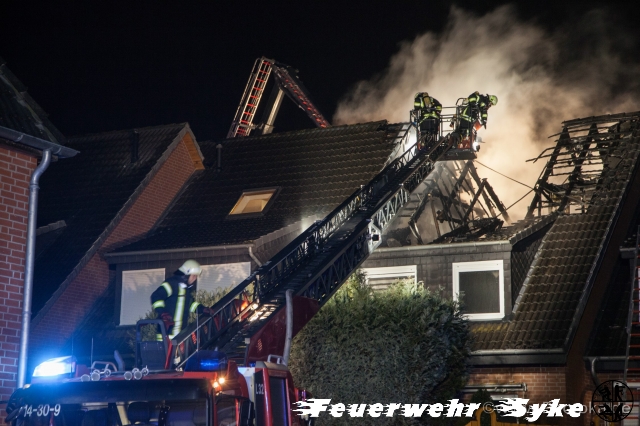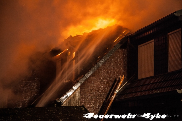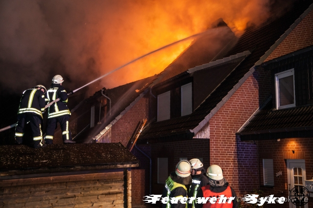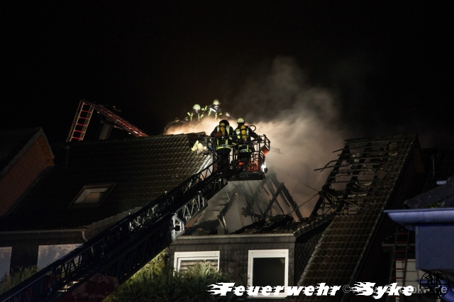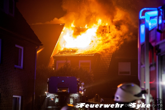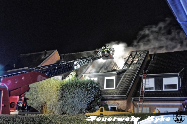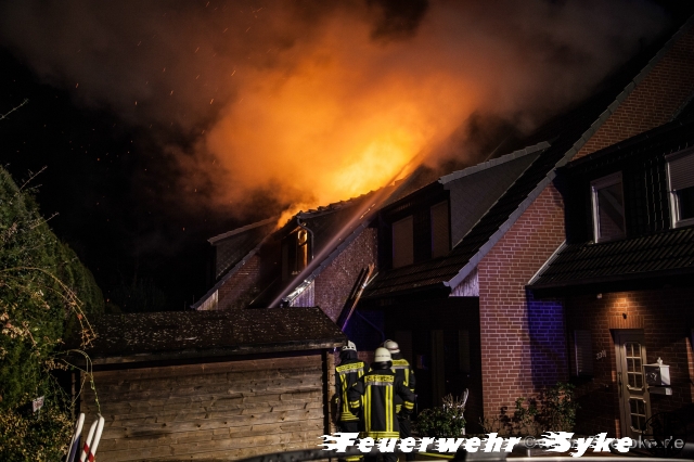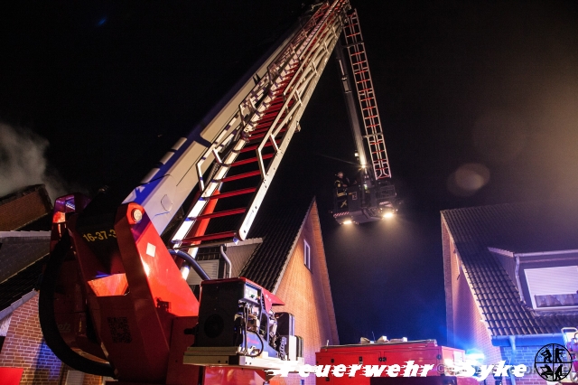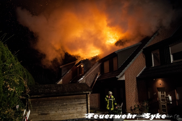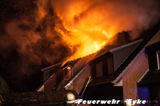 Eintreffen der Feuerwehr brannte der Dachstuhl eines Reihenmittelhauses von weither