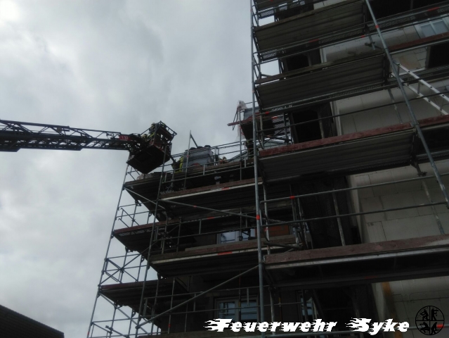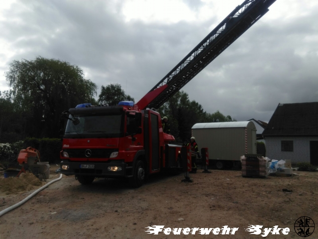 Syke. Während der Arbeiten an einem im Bau befindlichen viergeschossigenMehrfamilien- und Geschäftshaus in der Hauptstraße kam es zu einem Brand imDachbereich. Die Dachdecker waren gerade zur Frühstückspause nach unten zu ihrenFahrzeugen zurückgekehrt, als sie von einem Besucher des Floh- und Wochenmarktesauf eine Rauchentwicklung im Dachbereich aufmerksam gemacht wurden. Umgehendinspizierten sie den Bereich und fanden ihren Akkuschrauber und die Werkzeugkiste, inder er abgelegt worden war, in Flammen stehend vor. Das Feuer hatte bereits auf diedarunterliegende Schalung und Lattung übergegriffen. Mit vor Ort befindlichenLöschmitteln konnten die Dachdecker das Feuer vor Eintreffen der Syker Ortsfeuerwehreindämmen. Die Ortsfeuerwehr Syke wurde mit 22 Einsatzkräften um 9:40 Uhr zu demvermutlichen Dachstuhlbrand alarmiert. Nach einer schwierigen Anfahrt aufgrund derallwöchentlichen Syker Wochenendsgeschäftigkeiten brachten sie von außen vor demGebäude die Drehleiter mit ausreichender Wasserversorgung in Stellung, während imGebäude zwei Atemschutztrupps in Bereitstellung standen. Mit der Wärmebildkamerakonnte bestätigt werden, dass die Löschversuche der Dachdecker erfolgreich waren unddie Feuerwehr musste nicht weiter tätig werden. Es wurde ein Rettungswagen zurEinsatzstelle gerufen, um einen Mitarbeiter vom Rettungsdienst auf Verdacht vonRauchgas- oder Staubinhalation betreuen zu lassen. Zur weiteren Untersuchung wurdeder Mitarbeiter vom Rettungsdienst in ein Bremer Krankenhaus gebracht. Der Einsatz derFeuerwehr war glücklicherweise nach anderthalb Stunden aufgrund des schnellen undnachhaltigen Eingreifens der Mitarbeiter der Dachdeckerfirma und der Aufmerksamkeitdes Passanten beendet. Ebenfalls vor Ort war die Polizei.Gez. Ihno FißerPressewart der Stadtfeuerwehr Syke