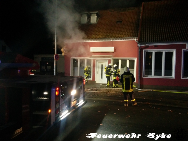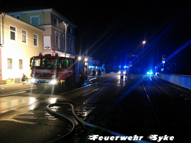 Die Ortsfeuerwehren Syke, Barrien, Henstedt und die Einsatzleitung Ort (ELO) der Stadtfeuerwehr Syke wurden zu einem Dachstuhlbrand alarmiert. Es qualmte an zahlreichen Stellen aus einem Restaurant mit einem bewohnten Nebengebäude. Die Ortsfeuerwehr Leeste mit der Drehleiter, die Ortsfeuerwehren Gödestorf-Osterholz-Schnepke und Okel, um genügend Atemschutzgeräteträger an der Einsatzstelle zu haben, und die ELO Bassum wurden daher ebenfalls alarmiert. Nach Erkundung der Lage stellte sich heraus, dass sich das Feuer auf Gegenstände im Erdgeschoss des Restaurants beschränkte. Der Brandrauch konnte aber durch das Gebäude ziehen, sodass dieses bis unter das Dach komplett verqualmt war. Alle Personen, die im direkt angrenzenden Nebengebäude waren, konnten das Gebäude stebständig vor Eintreffen der Feuerwehr verlassen. Mehrere Trupps unter Atemschutz gingen an verschiedenen Stellen in das Gebäude vor, um den Brandherd zu lokalisieren und das Gebäude zu durchsuchen. Das Feuer konnte schnell gelöscht werden. Anschließend wurde das Gebäude auf weitere Brandnester kontrolliert. Um Abluftöffnungen zu schaffen, mussten Teile des Daches abgedeckt werden, welche anschließend wieder notdürftig mit einer Plane geschlossen wurden, um Witterungseinflüsse zu vermeiden. Um das Gebäude rauchfrei zu bekommen, wurde es mit Überdruckbelüftern belüftet. Nach Beendigung aller Maßnahmen der Feuerwehr wurde die Einsatzstelle an die Polizei übergeben.