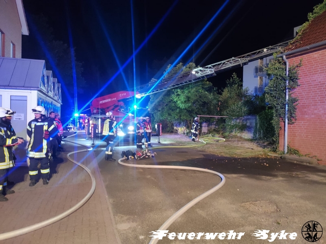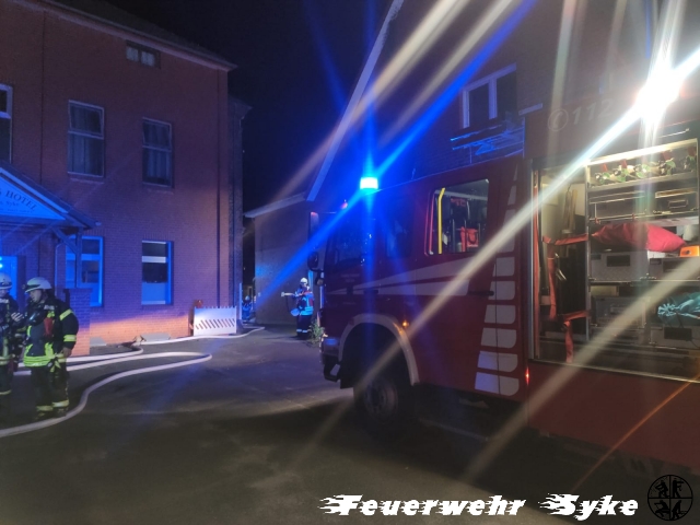 Syke (ts) Die Ortsfeuerwehren Syke, Barrien, Gessel-Ristedt und Henstedt wurden am 02.09.2022 gegen 23:40 Uhr mit dem Einsatzstichwort „F2 - Efeu brennt am Haus“ zu einem mittlerweile städtischen, ehemaligen Hotelgebäude in die Syker Hauptstraße alarmiert.