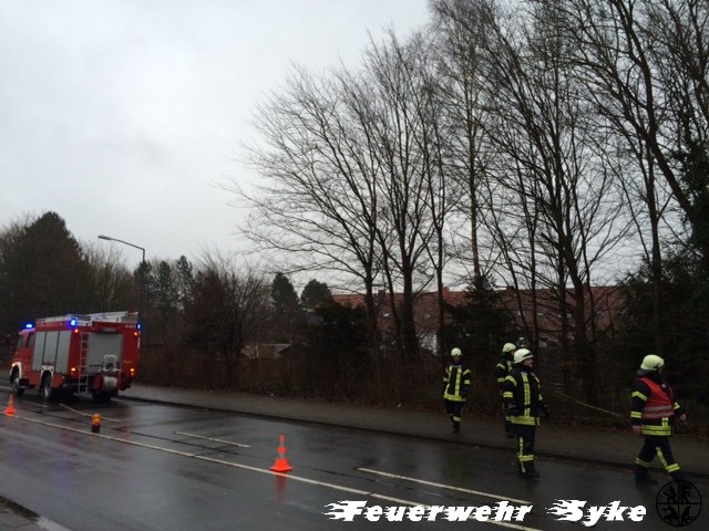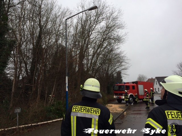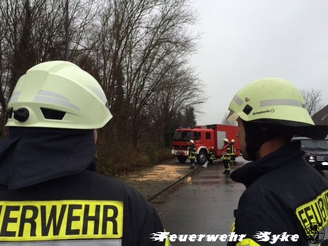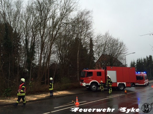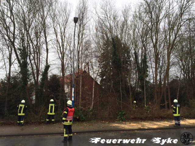 Drei kleine Birken und zwei größere Erlen drohten auf die Straße zufallen. Die Bäume wurden mit einer Motorkettensäge gefällt und anschließend mit der Seilwinde beiseite gezogen.