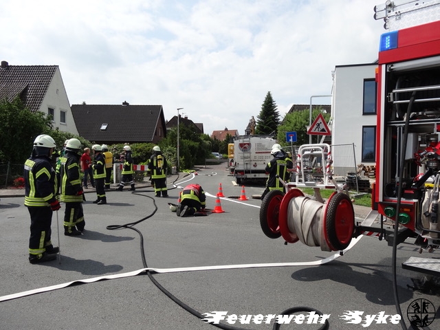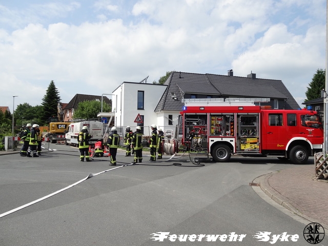 Am 30.5.2017, gegen 11.40 Uhr, beschädigte ein Bagger in der Ernst-Boden-Str./An der Weide bei Erdarbeiten eine Gasleitung aus PVC. Der Bagger hatte an einer 200er Gasleitung versehentlich den Aufsatzdom für einen Hausanschluss mit seiner Schaufel abgerissen. Das daraufhin in größeren Mengen ausströmende Gas erforderte den sofortigen Einsatz der Ortsfeuerwehr Syke.