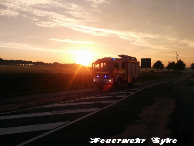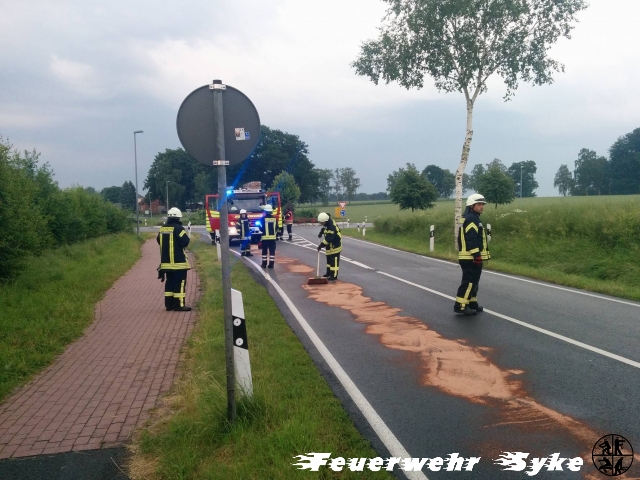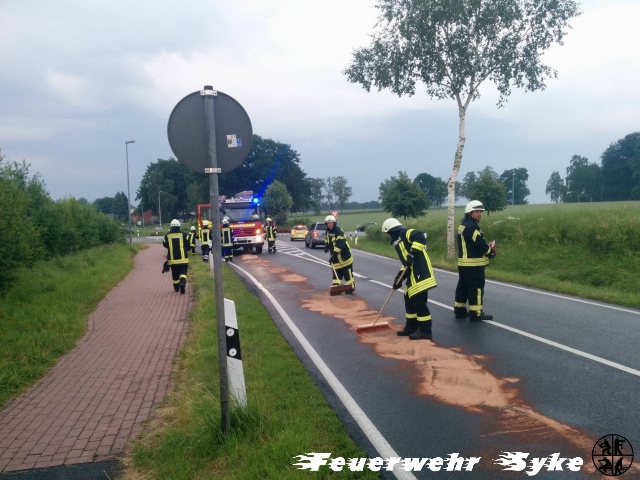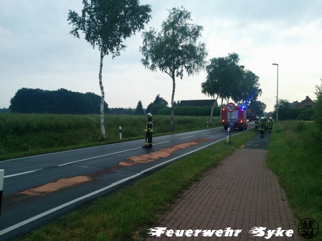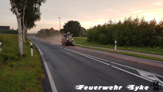 Syke (if) Um 20:14 Uhr wurde die Ortsfeuerwehr Syke zu einer Ölspur alarmiert. Beim Eintreffen an der genannten Einsatzstelle war zunächst relativ wenig Öl auszumachen. Man folgte der zunehmenden Spur durch mehrere Straßen quer durch das Syker Industriegebiet. Die Polizei folgte der Spur durch Nordwohlde und konnte letztlich den verursachenden Trecker in Dimhausen ausfindig machen. Die Länge wird auf 12 km geschätzt. Die 20 Syker Feuerwehrkräfte begannen Bindemittel an den Schwer- und Gefahrenpunkten auszubringen. Für die gesammte Strecke hätte der mitgeführte Vorrat nicht gereicht. Es wurde der Bauhof der Stadt Syke sowie die zuständige Straßenmeisterei Bruchhausen-Vilsen hinzugerufen. Die benachbarte Straßenmeisterei aus Bassum, sowie die Ortsfeuerwehren Nordwohlde und Dimhausen aus der Stadt Bassum wurden alarmiert und übernahmen die Gefahrenabwehr ab der Stadtgrenze. Durch die Straßenmeistereien wurden Warnschilder aufgestellt und mit einer Reinigungsmaschine Teile des Bindemittels aufgenommen. Während die Syker Ortsfeuerwehr den Einsatz gegen 22 Uhr beenden konnten, dauerte der Einsatz der 35 Nachbarn bis 22:30 Uhr an. Danach wurden die betroffenen Straßen den Straßenmeistereien übergeben.