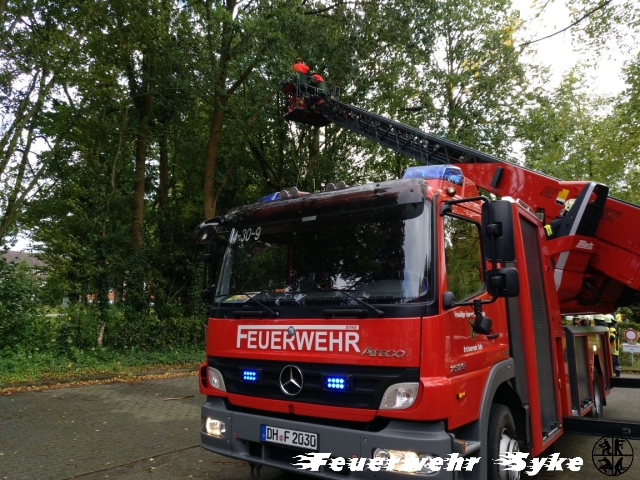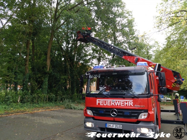 Die Ortsfeuerwehr Syke wurde zum Kreishaus alarmiert, da dort ein Baum umgestürzt war und große Teile eines weiteren Baumes herausgebrochen waren. Der umgestürte Baum blockierte keine Wege und stellte auch sonst keine weitere Gefahr dar, sodass Maßnahmen der Feuerwehr nicht erforderlich waren. Die Teile des anderen Baumes, die sowohl Fußgänger als auch parkende Fahrzeuge gefährdeten wurden mit Hilfe der Drehleiter und einer Kettensäge entfernt.