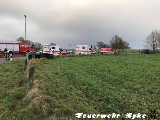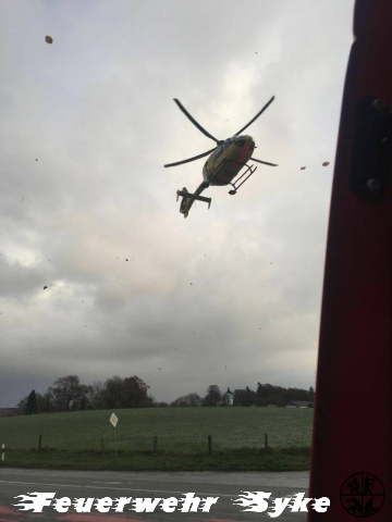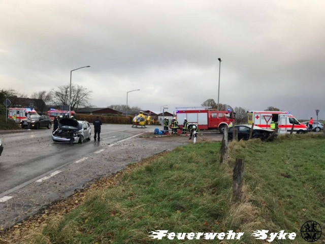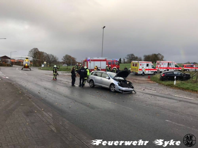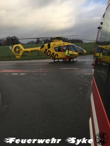 Auf der Finkenberg-Kreuzung war es zu einem Verkehrsunfall mit zwei beteiligten Pkw und insgesamt fünf Verletzen gekommen. Die Unfallstelle wurde abgesichert und austretende Betreibsstoffe mit Bindemittel abgebunden und aufgenommen. Die Verletzten wurden durch den Rettungsdienst versorgt, eine Person wurde mit dem Rettungshubschrauber in ein Krankenhaus transportiert. Die beschädigten Fahrzeuge wurden durch einen Abschleppdienst abtranportiert. Die Kreuzung war für die Dauer der Arbeiten an der Einsatzstelle vollgesperrt gewesen.