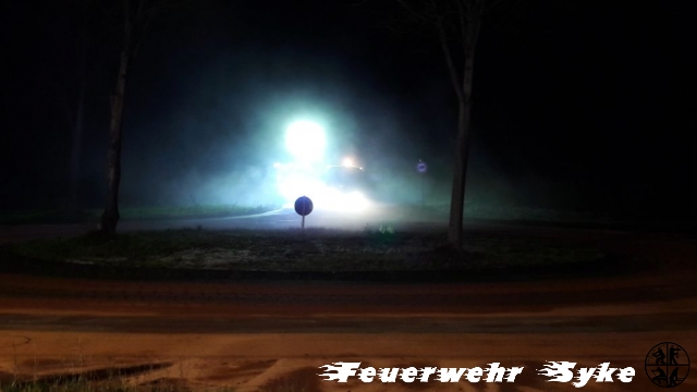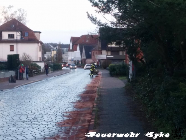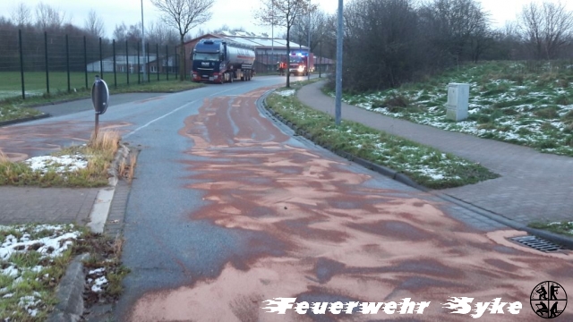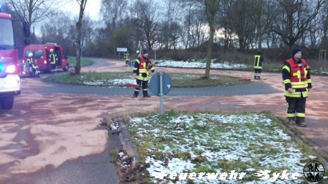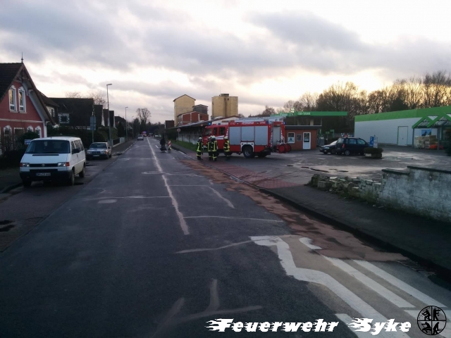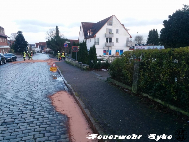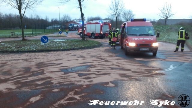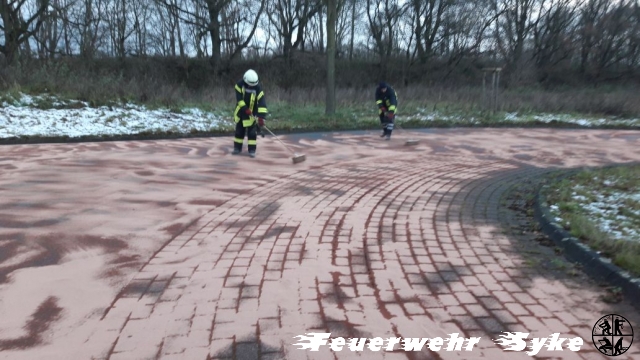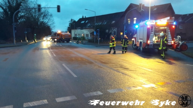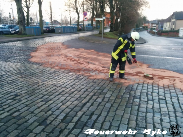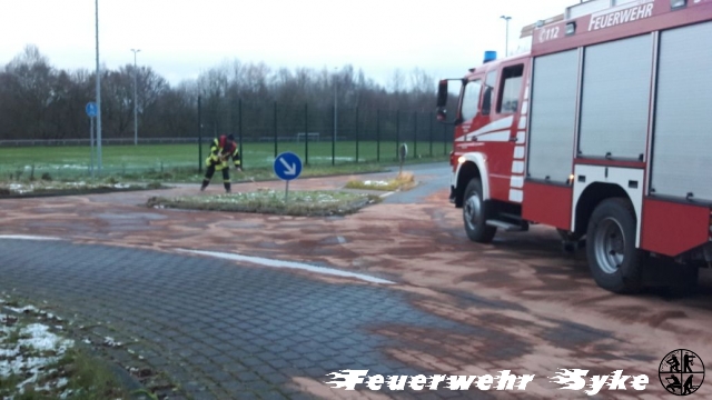 Die Ortsfeuerwehr Syke wurde zum Abstreuen einer Ölspur alarmiert. Die Länge der Ölspur stellte sich jedoch schnell als weitaus größer dar, als nach der Alarmierung zunächst angenommen wurde. Die Ölspur führte von der Kreuzung L340/Gesseler Straße über die Ferdinand-Salfer-Straße, Am Bahnhof, Bahnhofstraße, Gartenstraße, Bassumer Straße bis zur Kreuzung Ernst-Boden-Straße/Sulinger Straße. Die Ölspur hatte eine Gesamtlänge von etwa zwei Kilometern. Insgesamt wurden etwa 1,4 Tonnen Bindemittel ausgebracht um das Öl aufzufangen. Das Bindemittel wurde von einer Fachfirma mit einer Großkehrmaschine aufgenommen und entsorgt. Einige Streckenabschnitte mussten für die Maßnahmen zeitweise vollgesperrt werden.
