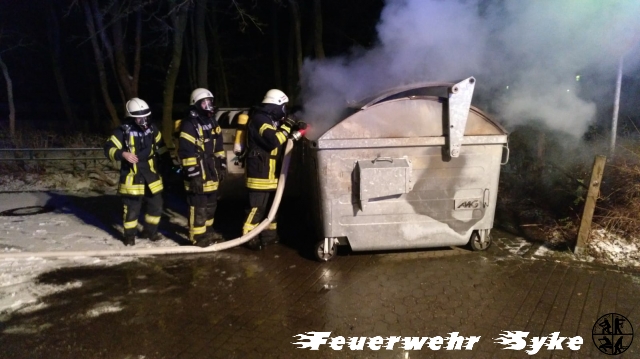 Die Ortsfeuerwehr Syke wurde zu einem Containerbrand alarmiert. Ein Müllcontainer stand in Flammen. Der Container wurde durch zwei Trupps unter Atemschutz geöffnet und mit Wasser geflutet, um das Feuer zu löschen und eine mögliche Rückzündung zu verhindern.