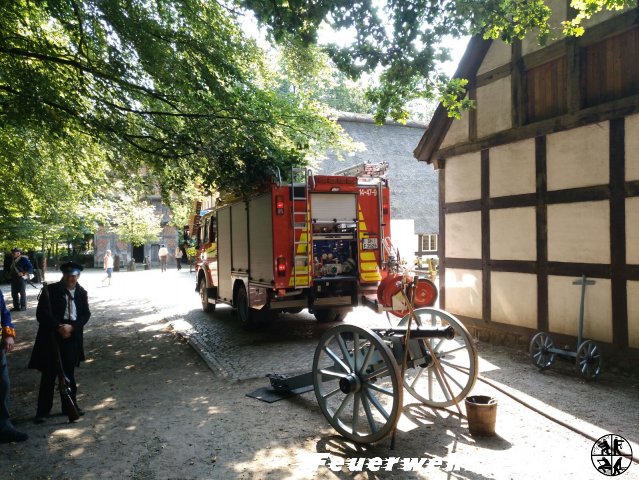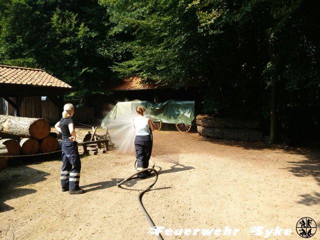 Vom 26.08. - 28.08.2016 findet dort die Veranstaltung "Von Waterloo in die Grafschaft Hoya" statt. Da hier auch kleinere Gefechts- und Exerzierszenen nachgespielt werden, in denen mit Schwarzpulver geschossen wird, wollte man aufgrund der Trockenheit jegliches Risiko ausschließen und bewässerte die gefährdeten Bereiche.